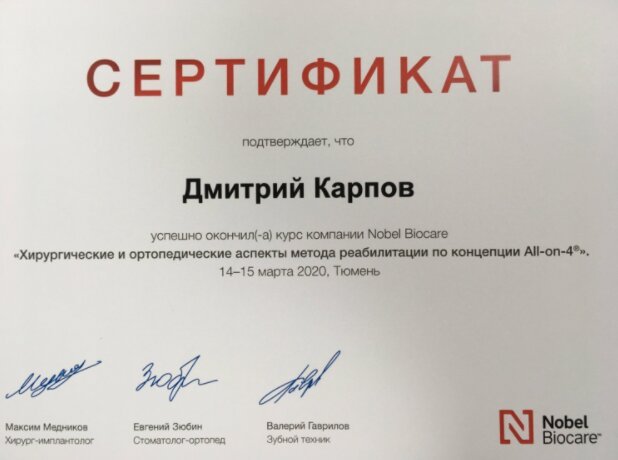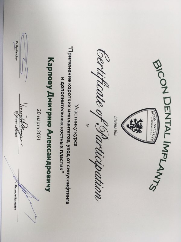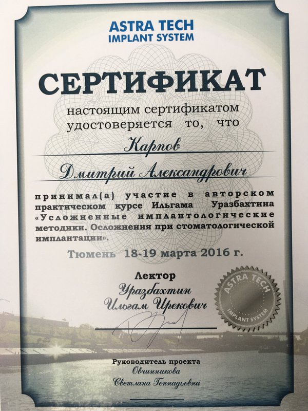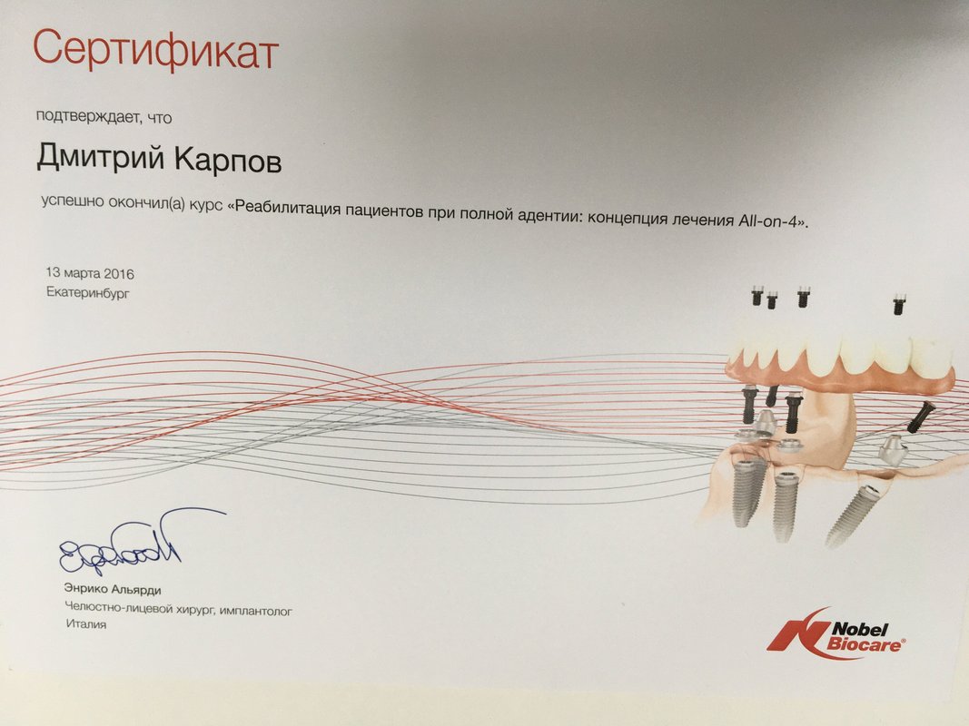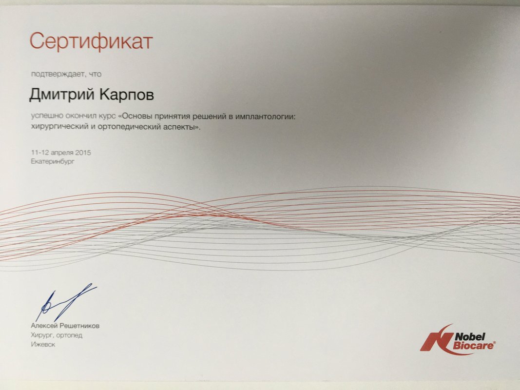 Карпов Дмитрий Александрович ставил отцу 3 имплантата с одномоментным удалением. В профессионализме и высокой квалификации доктора не приходится сомневаться. Все сделано быстро и с минимальным дискомфортом. Прямо в клинике делают снимки, ехать куда-либо и тратить время нет необходимости. Просторная клиника, современное оборудование и, самое важно, компетентные и приятные в общении доктора! Однозначно рекомендую!