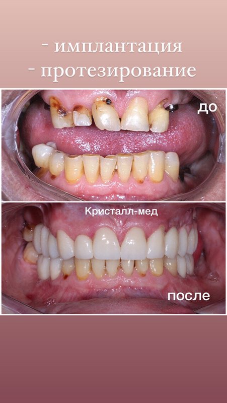 Хотела поставить импланты, но у меня проблемы со здоровьем. У меня аутоиммунное заболевание, ревматоидный артрит и пила я очень серьёзные таблетки, поэтому мне во всех местах, куда я обращалась, отказывали и только в этой клинике взялись за такую ответственную работу. Я сама медработник, ездила из области, разговаривала с разными врачами, но меня не устраивала их позиция. А здесь Дмитрий Александрович посмотрев, взялся за меня и принялся за работу, сделал наращивание кости. Лечение проводила Татьяна Валерьевна, замечательный доктор от Бога, скульптор. Мирза Русланович поставил временные коронки, скоро будут делать протезирование. Сейчас перестала пить обезболивающие таблетки и вышла из генной инженерии, не пью тяжелые таблетки. Вначале скрыла от врачей, что у меня немного повышен сахар, так как внутри доверилась, что все будет хорошо, так и вышло. В этой стоматологии всех докторов взяли, как на подбор, все супер компетентные. Сейчас созваниваемся, уточняют, как у меня дела. Спасибо большое врачам, клинике! Желаю только процветания!