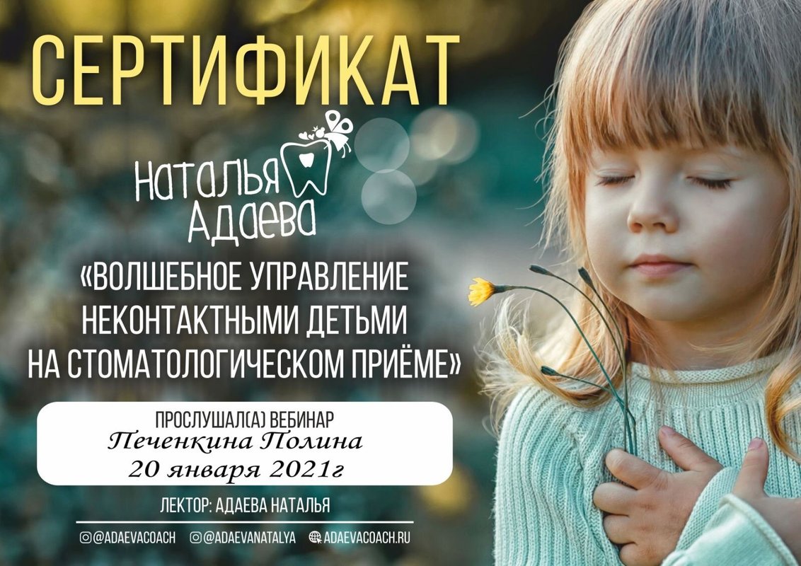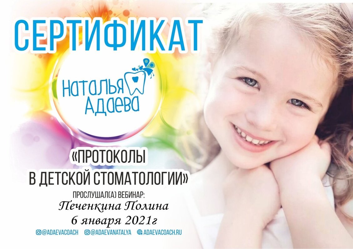 Все классно прошло! Сотрудники молодцы. Я даже на форуме мамочкам ставила в пример эту клинику, как нужно работать. Очень хороший подход у Полины Владимировны Печенкиной к ребенку, дочка идет легко к врачу, не плачет на приеме. Пломба у нас не выпала, отлично держится, аккуратно выполнена работа, ничего дочке не мешает, все комфортно, цвет пломбы такой, что не отличишь от самого зуба. Полина Владимировна тщательно лечит зубу детям, добрая, не торопится никуда. Если дочка нервничает, она может ее расположить к себе. Все зубы долечили уже практически у Печенкиной. В общении стоматолог мне импонирует, добрый врач, интеллигентно и дипломатично ведет диалог. Врач справился в последний прием за полчаса. Все по стерильности инструментов просто отлично, никогда после этого врача не было стоматитов и заедков на губах.