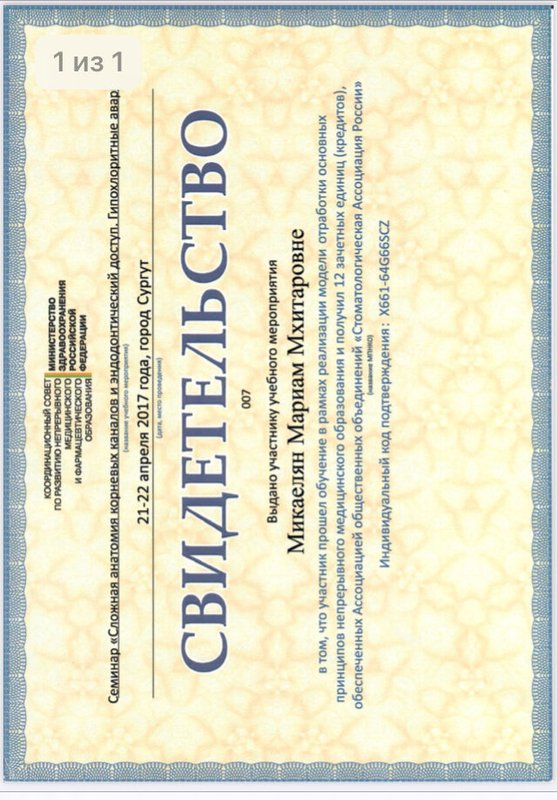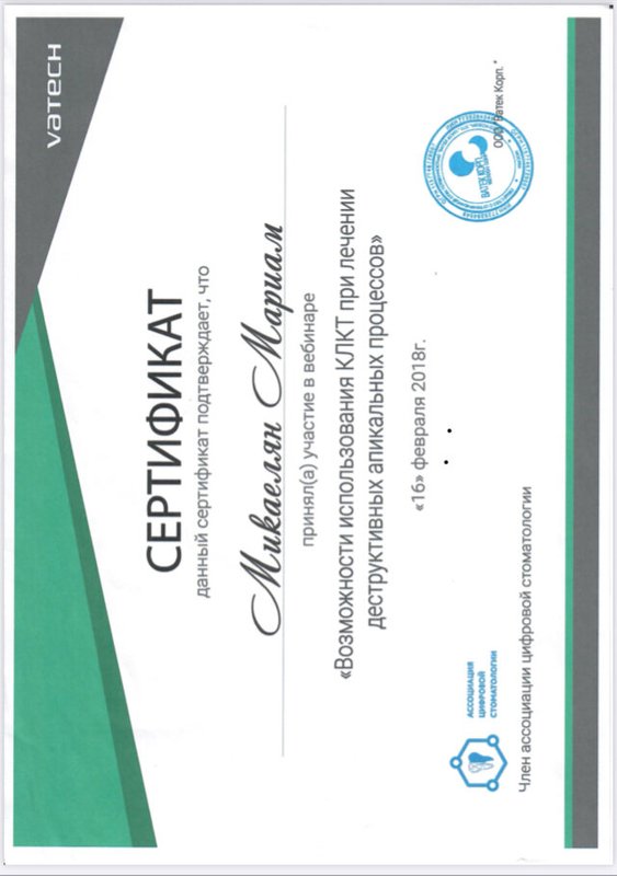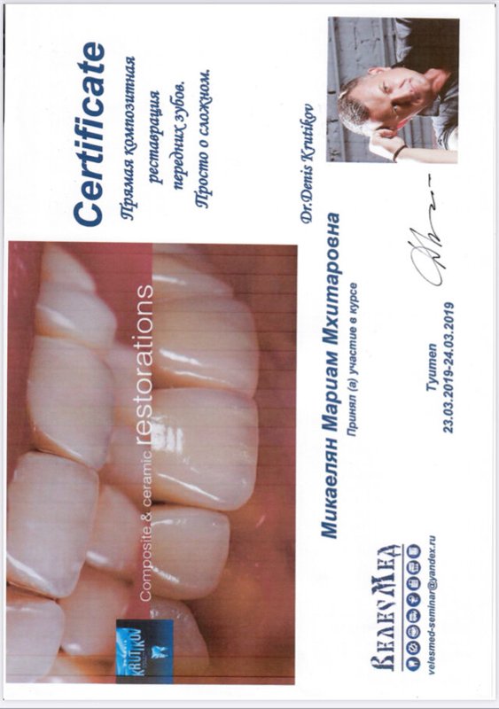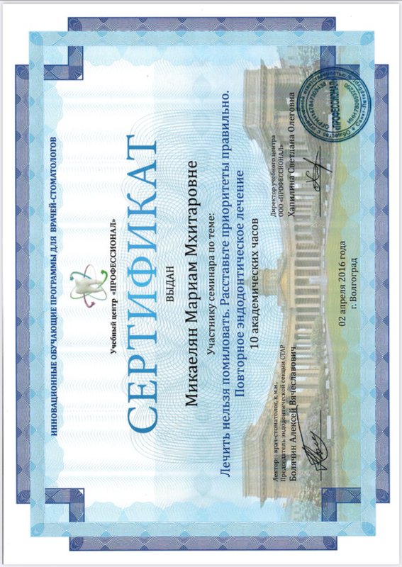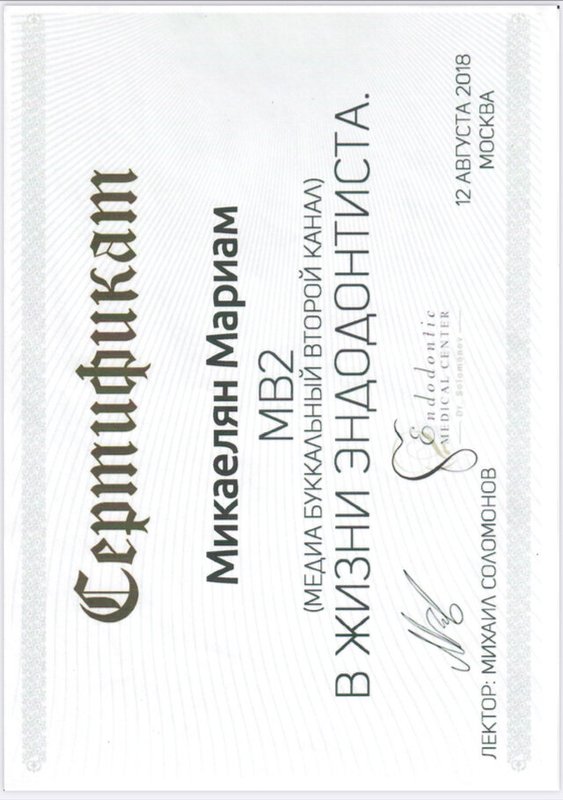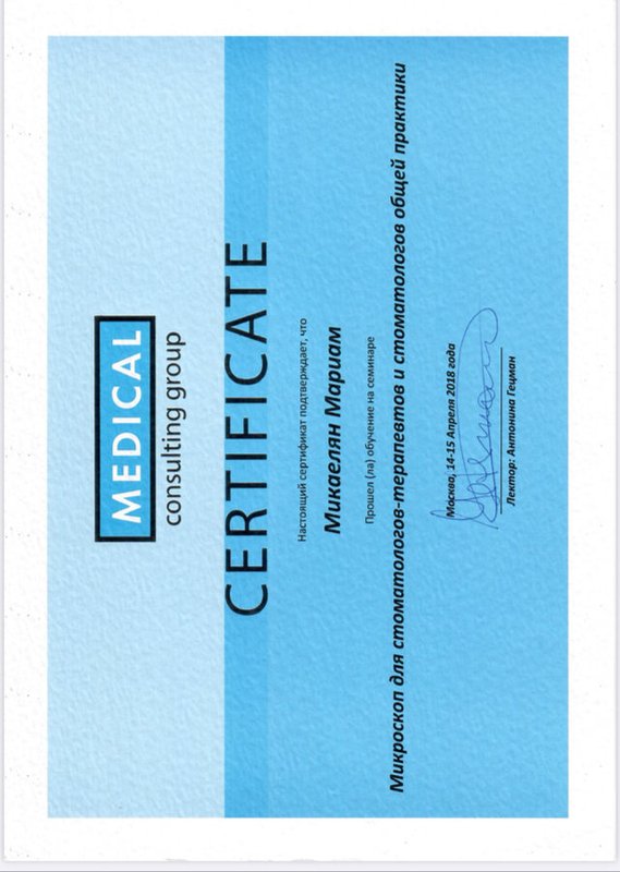 Микаелян Мариам Мхитаровна является стоматологом-терапевтом. Мариам Микаелян в том числе проводит отбеливание зубов, реставрацию зубов, профессиональную гигиену полости рта, реминерализирующую терапию зубов и эндодонтическое лечение, выполняет снятие зубного камня, а также занимается лечением некариозных поражений зубов, кариеса, пародонтита, пульпита и периодонтита.